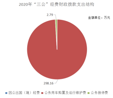 2020年“三公”经费财政拨款支出决算中,因公出国(境)经费支出决算数为零;公务用车购置及运行维护费支出决算298.16万元,占99.08%;公务接待费支出决算2.79万元,占0.92%。具体情况如下: