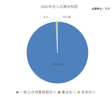 2020年本年收入合计17143.01万元,其中:一般公共预算拨款收入17021.53万元,占99.29%;事业收入0.2万元,占0.01%;其他收入121.28万元,占0.70%;政府性基金预算财政拨款收入、上级补助收入、经营收入、附属单位上缴收入均为零。