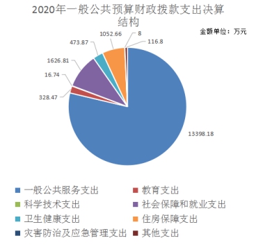 2020年一般公共预算财政拨款支出17021.53万元,主要用于以下方面:一般公共服务(类)支出13398.18万元,占78.71%;教育支出(类)328.47万元,占1.93%;科学技术(类)支出16.74万元,占0.10%;社会保障和就业(类)支出1626.81万元,占9.56%;卫生健康(类)支出473.87万元,占2.78%;住房保障(类)支出1052.66万元,占6.18%;灾害防治及应急管理(类)支出8万元,占0.05%;其他(类)支出116.80万元,占0.69%。